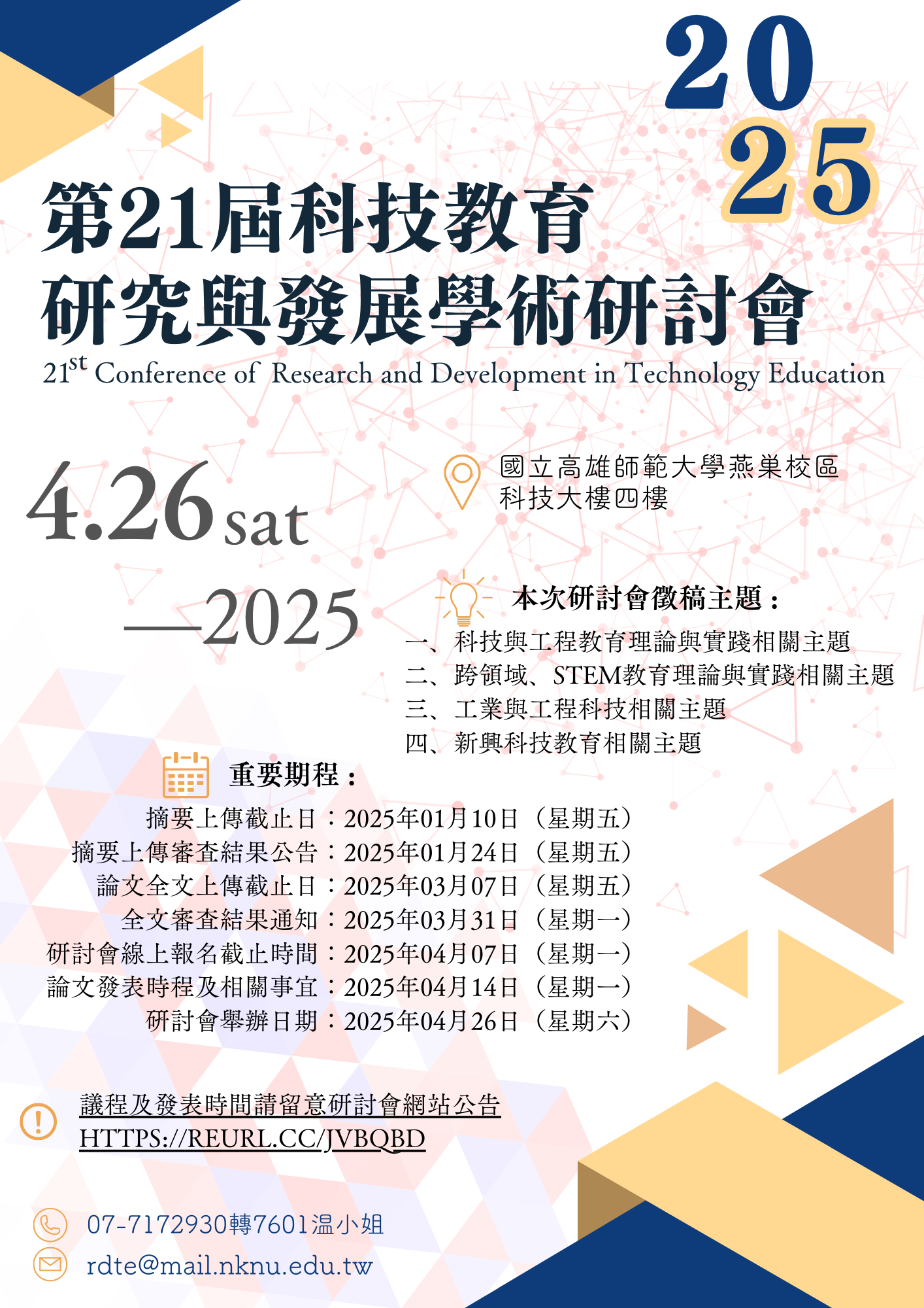 六、發表須知:請於114年04月26日(星期六)至研討會地點(國 立高雄師範大學燕巢校區科技大樓4樓工教系)進行口頭發 表,議程及發表時間請留意研討會網站公告。