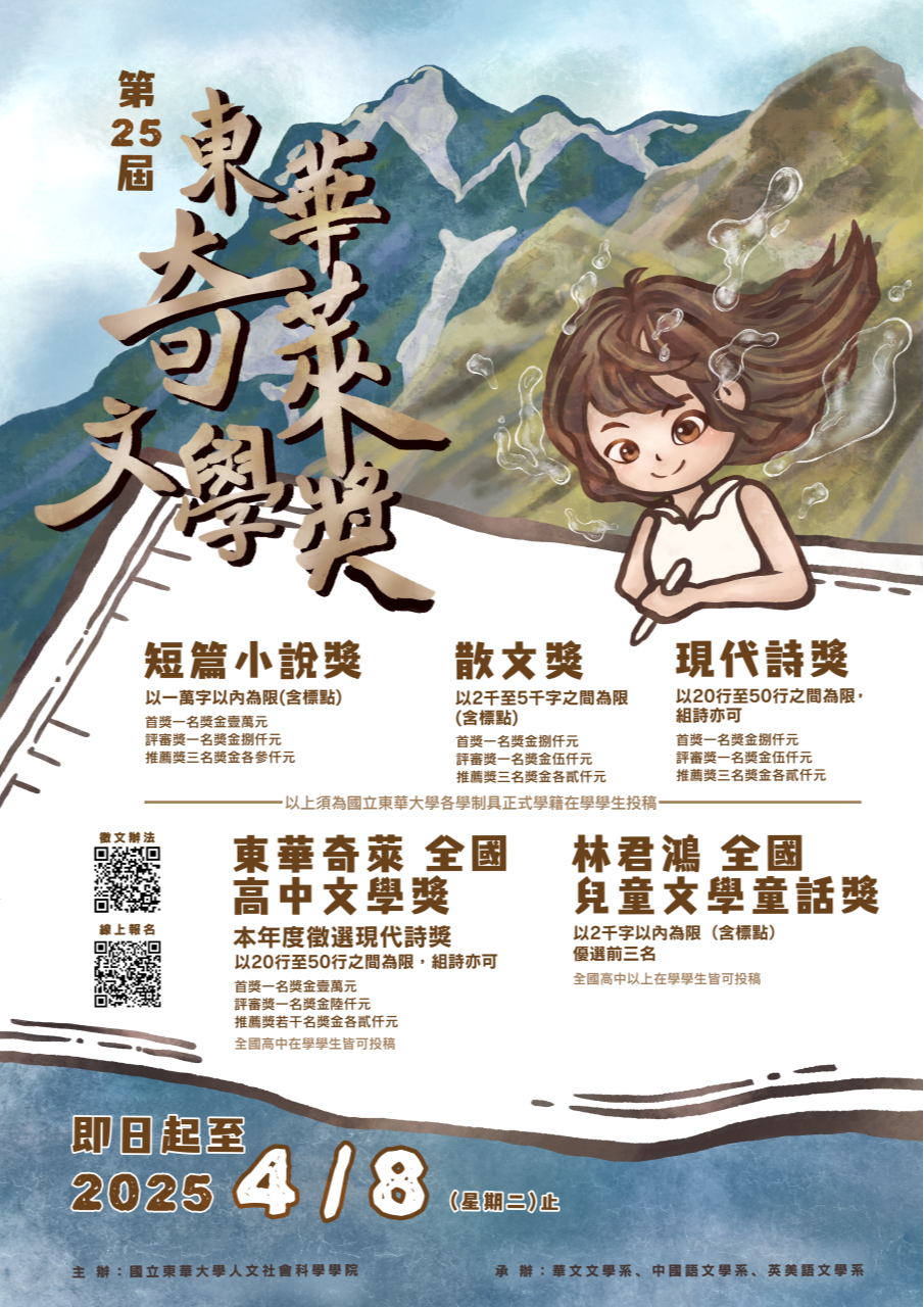 一、「第25屆東華奇萊文學獎」針對高中生徵文獎項為「東華 奇萊全國高中文學-現代詩獎」及「林君鴻全國兒童文學童話獎」,希冀鼓勵國內創作風氣,培養文學涵養。
