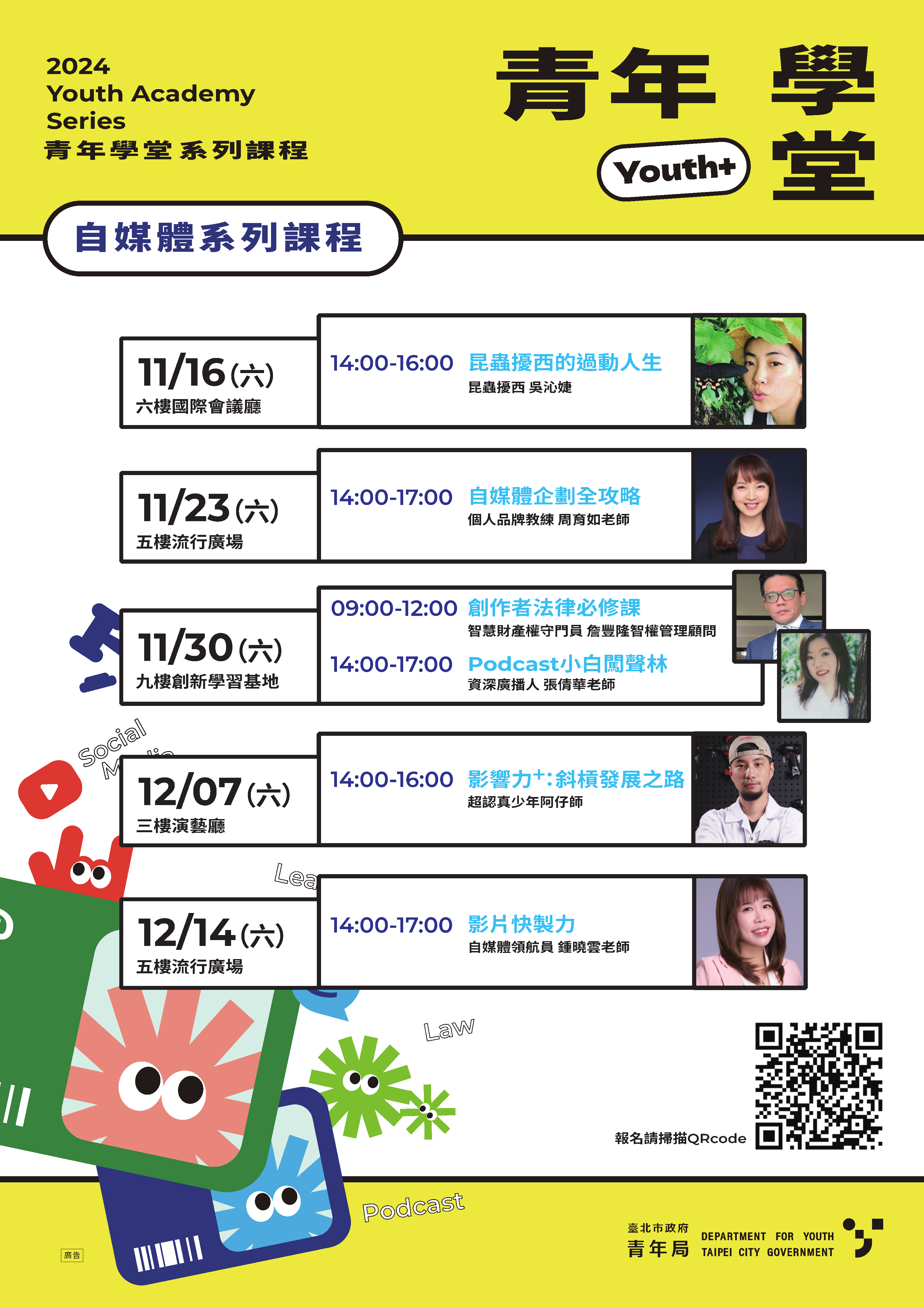 三、檢附「青年學堂-自媒體系列課程」海報電子檔1份,活動內容可詳見報名網頁。若仍有相關問題,亦可洽詢青年局郭小姐,電話:02-2351-4078分機1112。