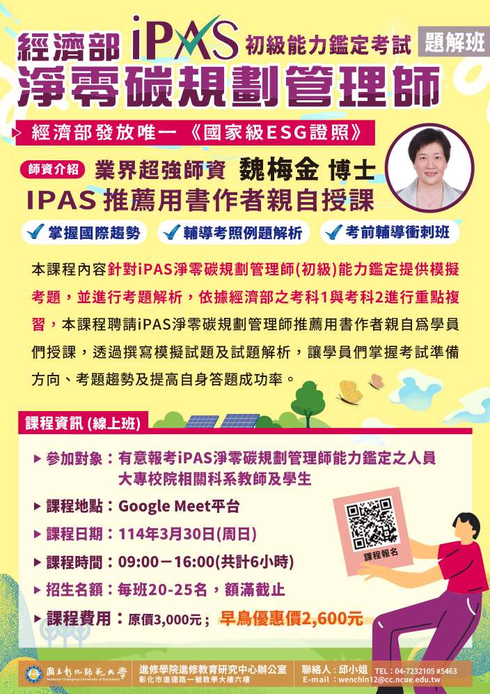 說明: 一、「114年iPAS淨零碳規劃管理師(初級)能力鑑定輔導班(第 二期)」 (一)課程特色:針對iPAS淨零碳規劃管理師關鍵能力、鑑定 重點、輔助教材說明,增進零碳規劃管理相關之國際公 約與倡議、關貿政策及氣候變遷下全球因應與做法等知識,提升學員從事淨零碳規劃管理之能力 。 (二)課程時間:114年03月08日至114年03月29日(六、日)09: 00~16:00。 (三)課程費用:13,000元,報名享早鳥價10,500元,舊生 10,500元(含講義費;考試費依報考科目另計)。本門課 程 提供團報服務,如需進行團體報名,請於 報名本課程時進行備註,詳細資訊敬請來電詢問。 二、「114年iPAS淨零碳規劃管理師(初級)能力鑑定考試解題 班」 (一)課程特色:本課程聘請iPAS淨零碳規劃管理師推薦用書 作者親自授課,依據經濟部之考科1與考科2進行重點複 習,透過模擬試題及解析,讓學員掌握考試準備方向、 考題趨勢並提高自身答題成功率。 (二)課程時間:114年03月30日(日)09:00~16:00。 (三)課程費用:新台幣 3,000元。報名享早鳥價 2,600元 (含講義費;考試費依報考科目另計)。本門課程提供團 報 服務,如需進行團體報名,請於報名本課程時進行備 註,詳細資訊敬請來電詢問。 三、報名步驟:線上報名,請至本校進修學院報名管理系統報名。如第一次報名,請先申請帳號。(https://aps.ncue. edu.tw/cee/index.php) 四、相關資訊請詳閱各課程招生簡章,如有相關問題,請逕向 簡章中聯絡人洽詢:邱小姐,04-7232105分機5463,Email:wenchin12@cc.ncue.edu.tw。