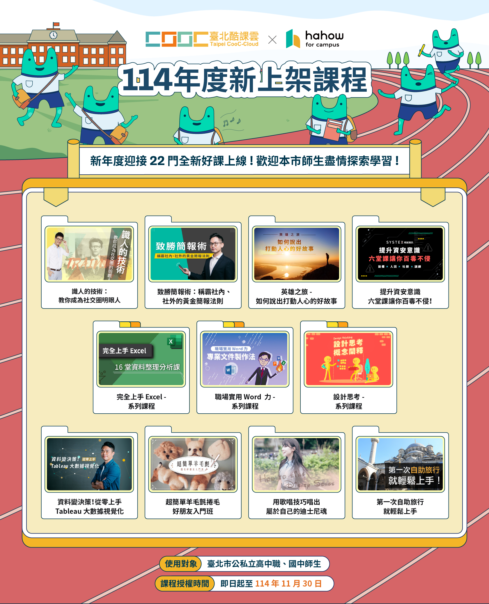 一、為提供本市師生多元跨域數位學習資源,臺北酷課雲自112年12月起新增「Hahow for Campus」授權課程服務,提供數位行銷、商用外語、程式語言、數據分析、視覺設計、職場技能以及多元生活等課程,適合師生自主學習、豐富學習歷程及生涯探索。