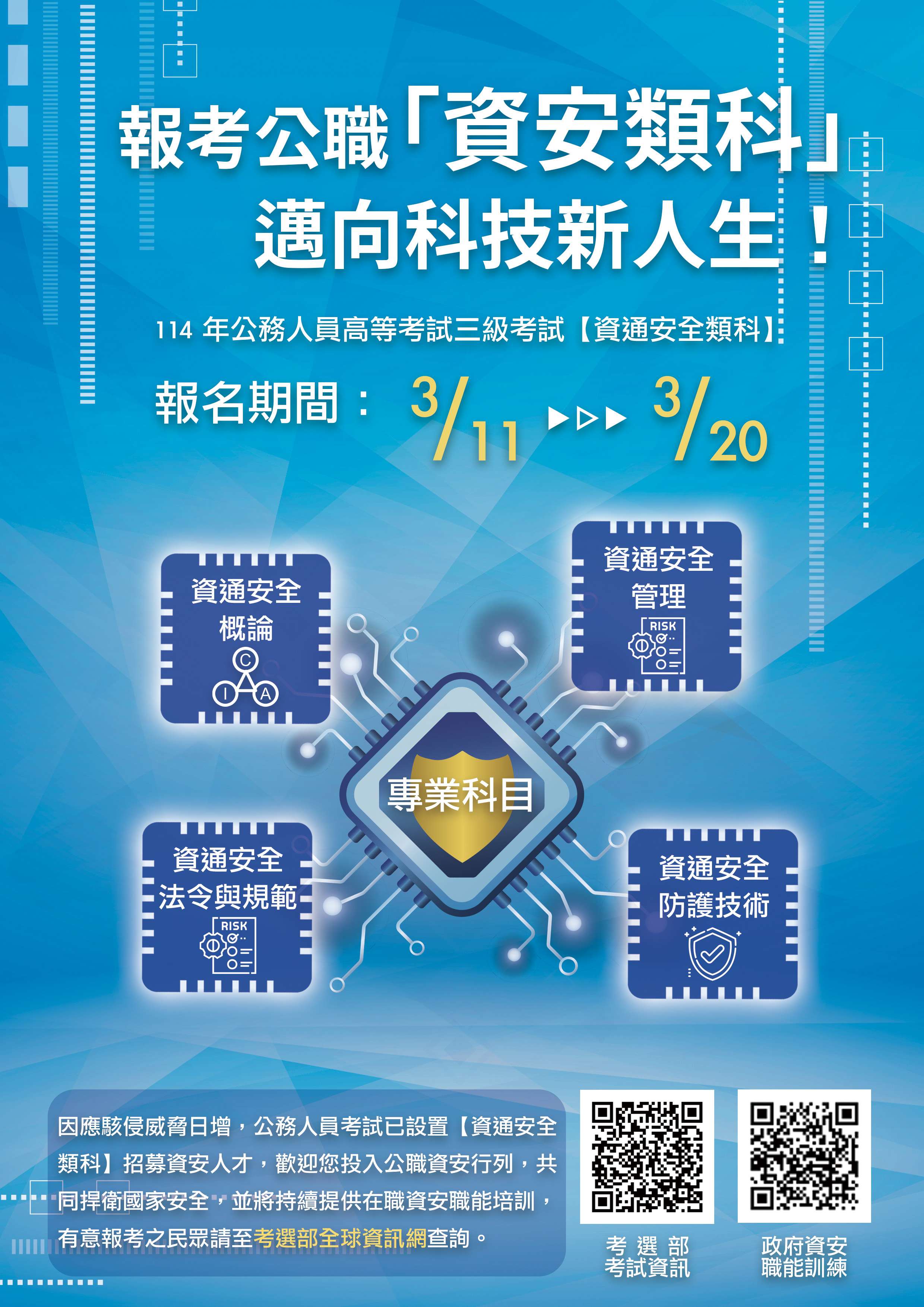 因應駭侵威脅日增,公務人員考試已設置【資通安全類科】招募資安人才,歡迎您投入公職資安行列,共同捍衛國家安全,並將持續提供資安職能生涯培訓,114年考試自3月11日至3月20日受理網路報名,有意報考之民眾請至考選部全球資訊網查詢。