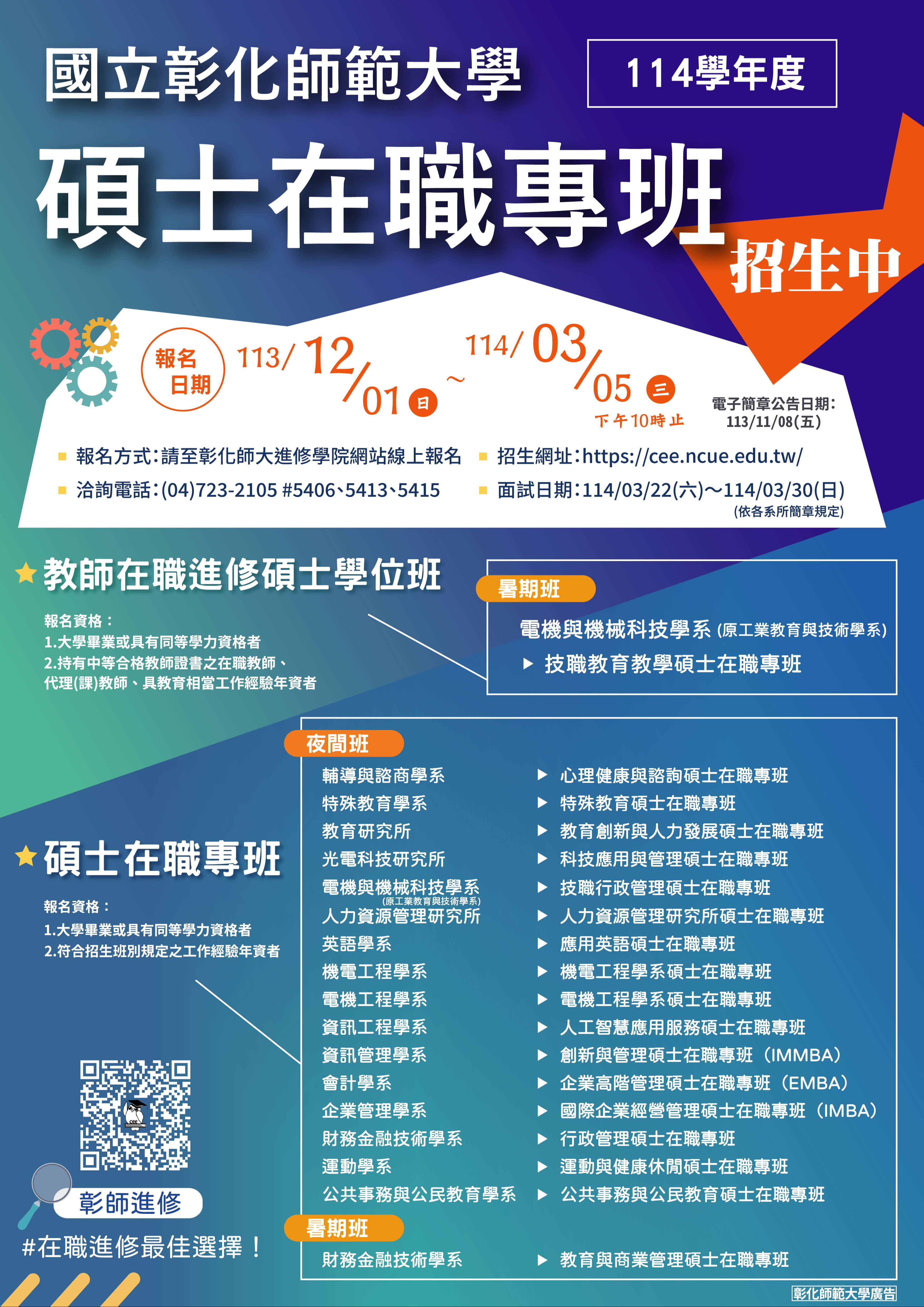 說明: 一、本校榮獲2024年英國泰晤士報高等教育(Times Higher Education, 簡稱THE)「世界大學影響力排名」全臺第14 名、國立大學第10名。其中,在以聯合國「永續發展目標 (SDGs)」所設定的17項衡量指標中,本校於「Quality Education 優質教育」項目,榮獲全臺第1名(世界排名 79)佳績;而根據《遠見雜誌》公布之2024年臺灣最佳大學排行榜,本校榮獲公立大學排名全臺第19名,傑出的治 學成效獲得國內及國際肯定,彰顯本校具備優良師資及學 習環境,並持續投入資源、提升教學品質、促進產學媒合 與國際交流。 二、招生班別: (一)教師在職進修碩士在職專班:技職教育教學碩士在職專 班(暑期班)。(二)碩士在職專班: 1、夜間班:心理健康與諮詢、特殊教育、教育創新與人 力發展、科技應用與管理、技職行政管理、人力資源 管理研究所、應用英語、機電工程學系、電機工程學 系、人工智慧應用服務、創新與管理(IMMBA)、企業高 階管理(EMBA)、國際企業經營管理(IMBA)、行政管 理、運動與健康休閒、公共事務與公民教育等碩士在 職專班。 2、暑期班:教育與商業管理碩士在職專班。 三、重要試務日期: (一)報名日期:即日起至114年3月5日(週三)晚上10時止,一律採網路報名。 (二)面試日期:114年3月22日(週六)至114年3月30日(週 日),各系所面試日期請參閱簡章。 (三)放榜日期:114年4月21日(週一)。 四、招生簡章及相關資訊已公告於本校進修學院網頁,歡迎至 本校進修學院官網下載(https://cee.ncue.edu.tw/)。 五、如有報名相關問題,請逕向本校進修學院教學服務組洽詢 (電話:04-7232105分機5406、5413、5415)。