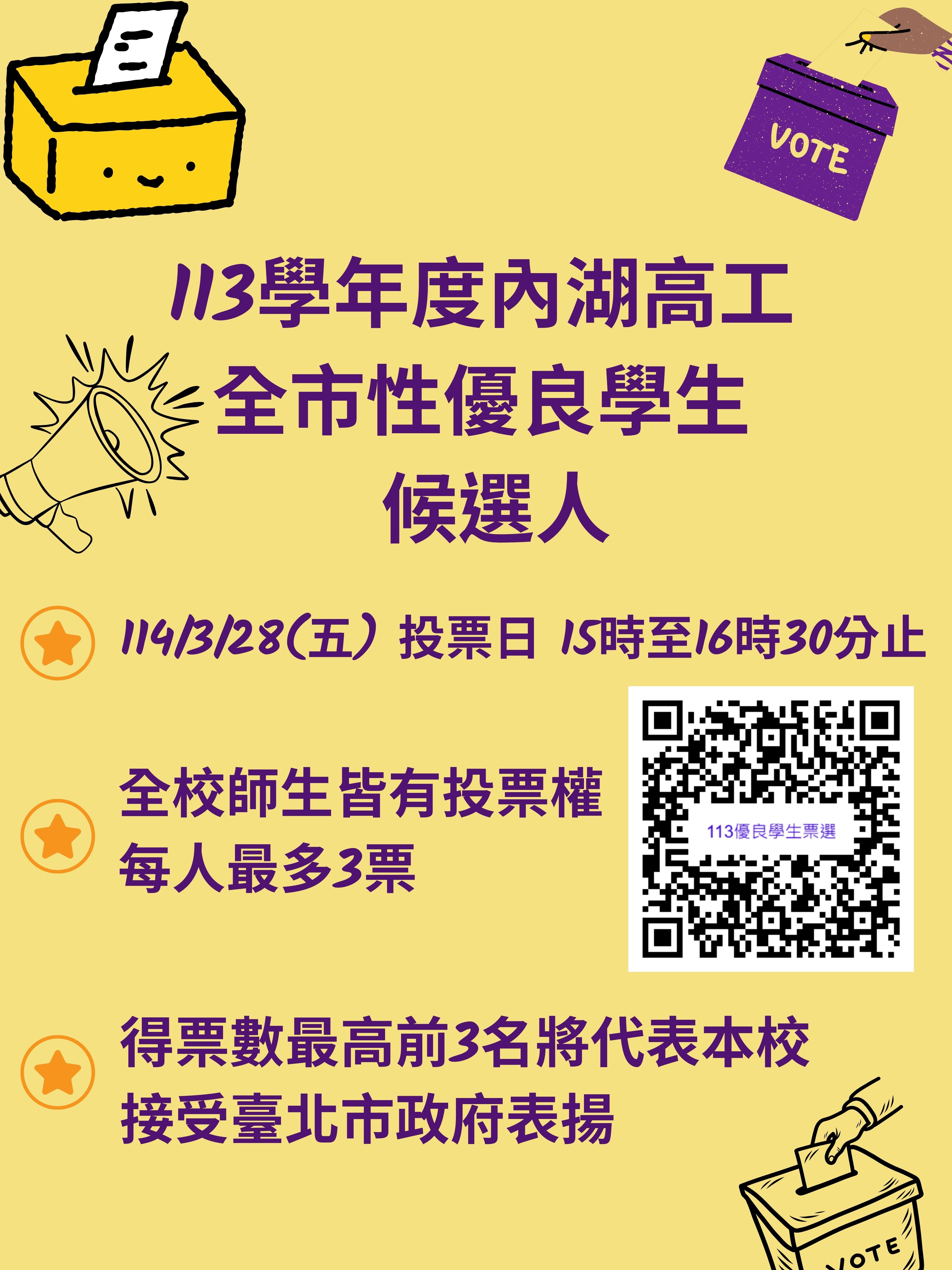 (一) 投票結束後將隨機抽選40名參與投票之同學,提供便利商店100元商品卡1張之獎勵,得獎名單將於114年4月2日放學前公告校網。