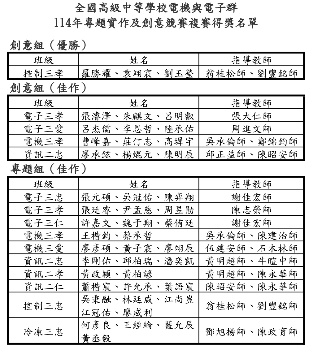 賀!!!本校學生參加全國高級中等學校電機與電子群114年專題實作及創意競賽複賽榮獲1優勝、14佳作專題組-10佳作 創意組-1優勝、4佳作