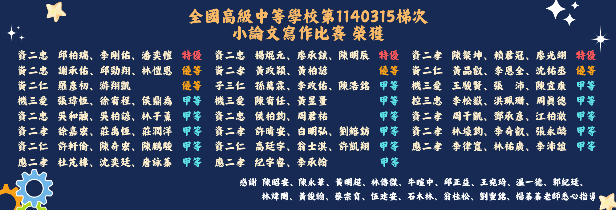 全國高級中等學校第1140315梯次小論文寫作比賽得獎名單 | |||||||||