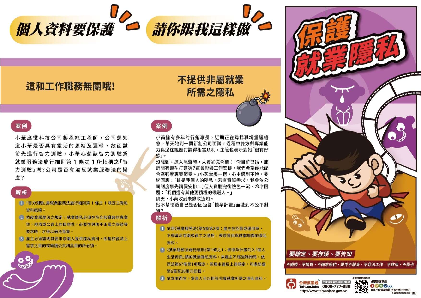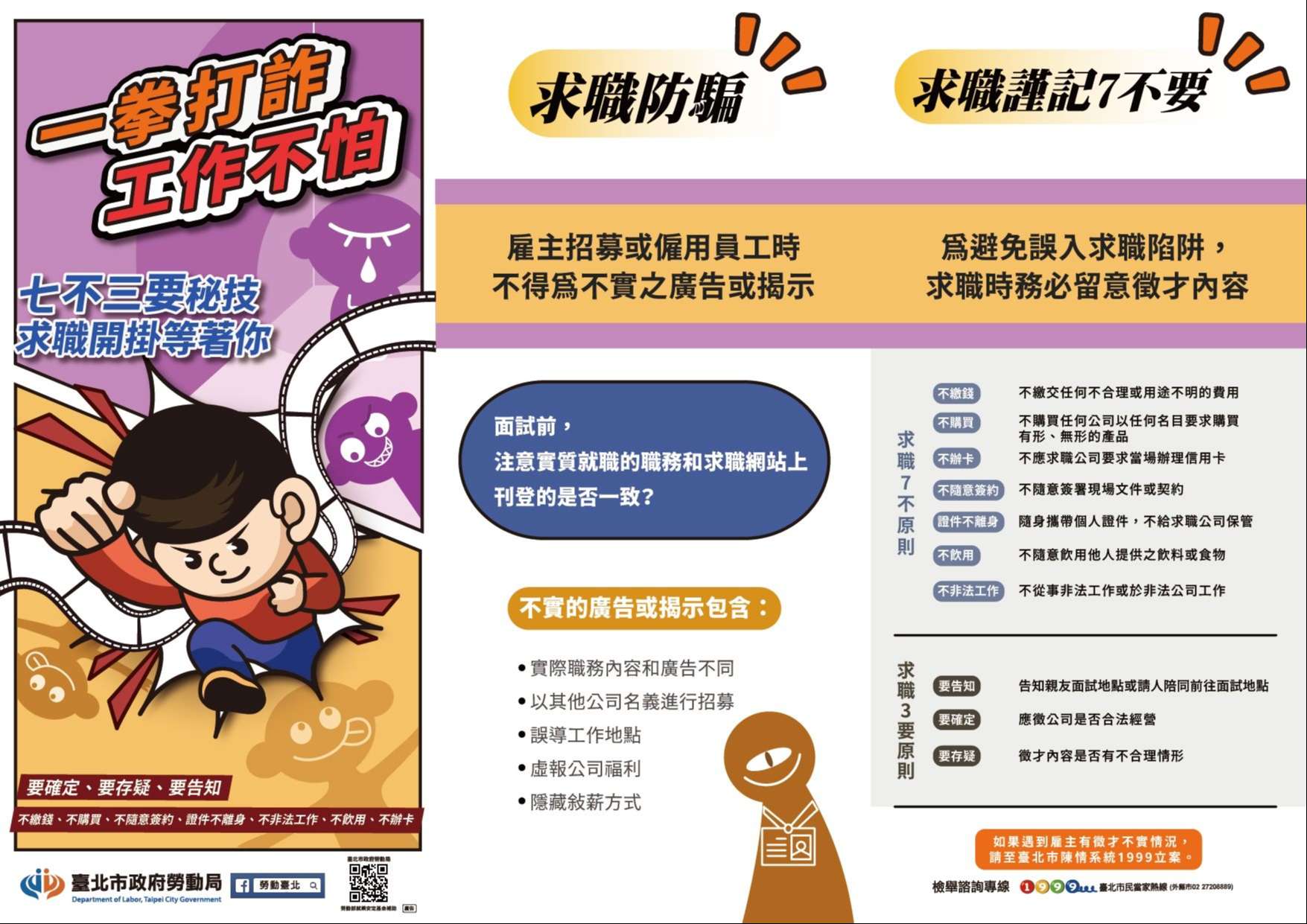 三、旨揭摺頁及海報電子檔置於該局官網/業務服務/勞動服務/就業安全/1.求職防騙專區與6.就業隱私專區,貴校亦可自行下載