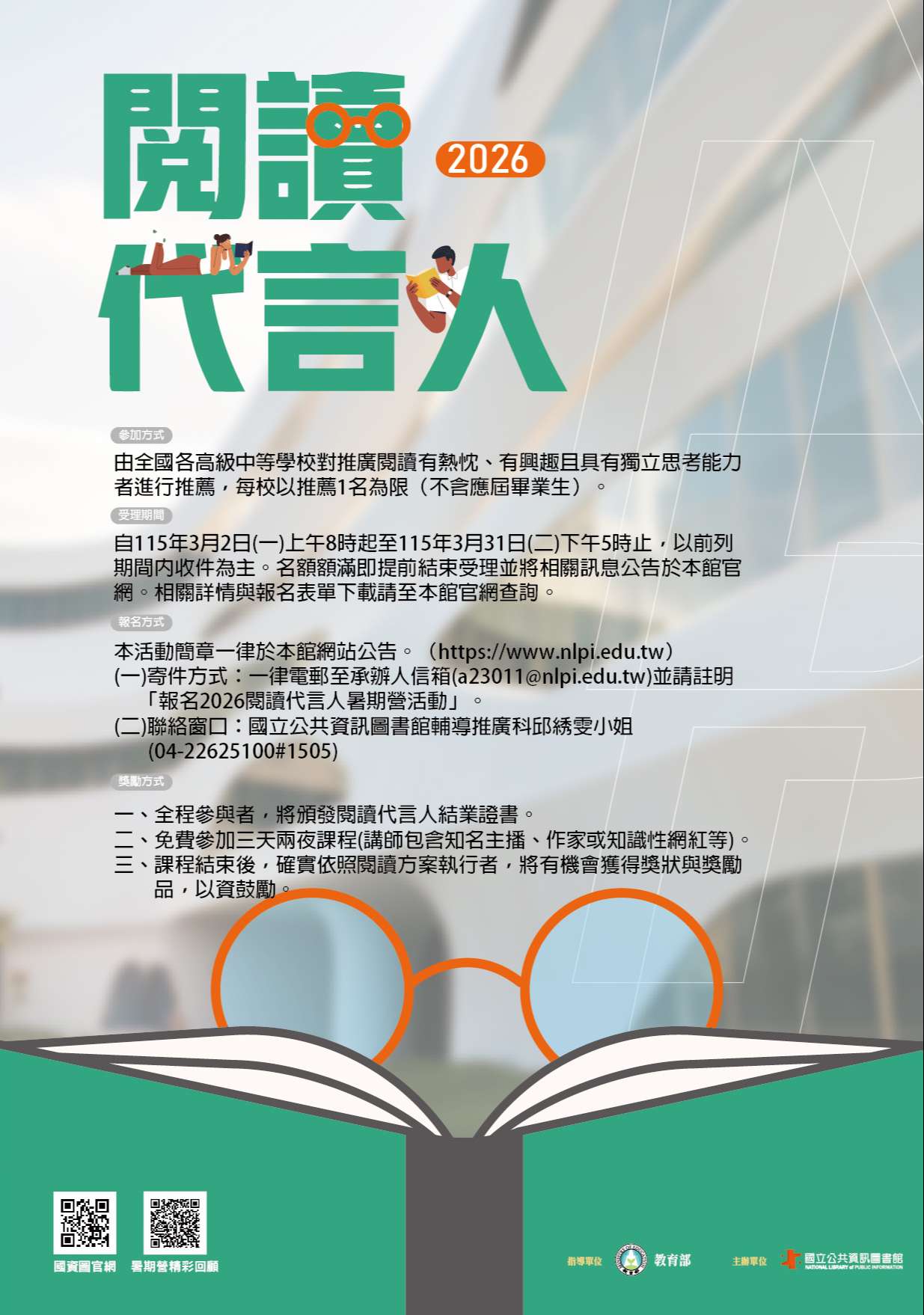 三、報名方式: (一)推薦期間:115 年 3 月 2 日(星期一)上午8時起至 3 月 31 日(星期二)下午 5 時止。 (二)收件方式:一律採電子郵件報名,請於前列期間內將報 名資料表、學生證影本及同意書以電子郵件傳送至本館 承辦人信箱(a23011@nlpi.edu.tw),名額額滿即提前 結束受理。