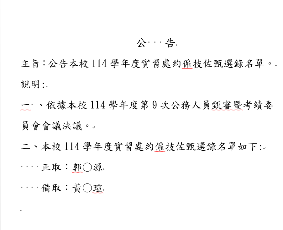公告本校114學年度實習處約僱技佐甄選錄名單