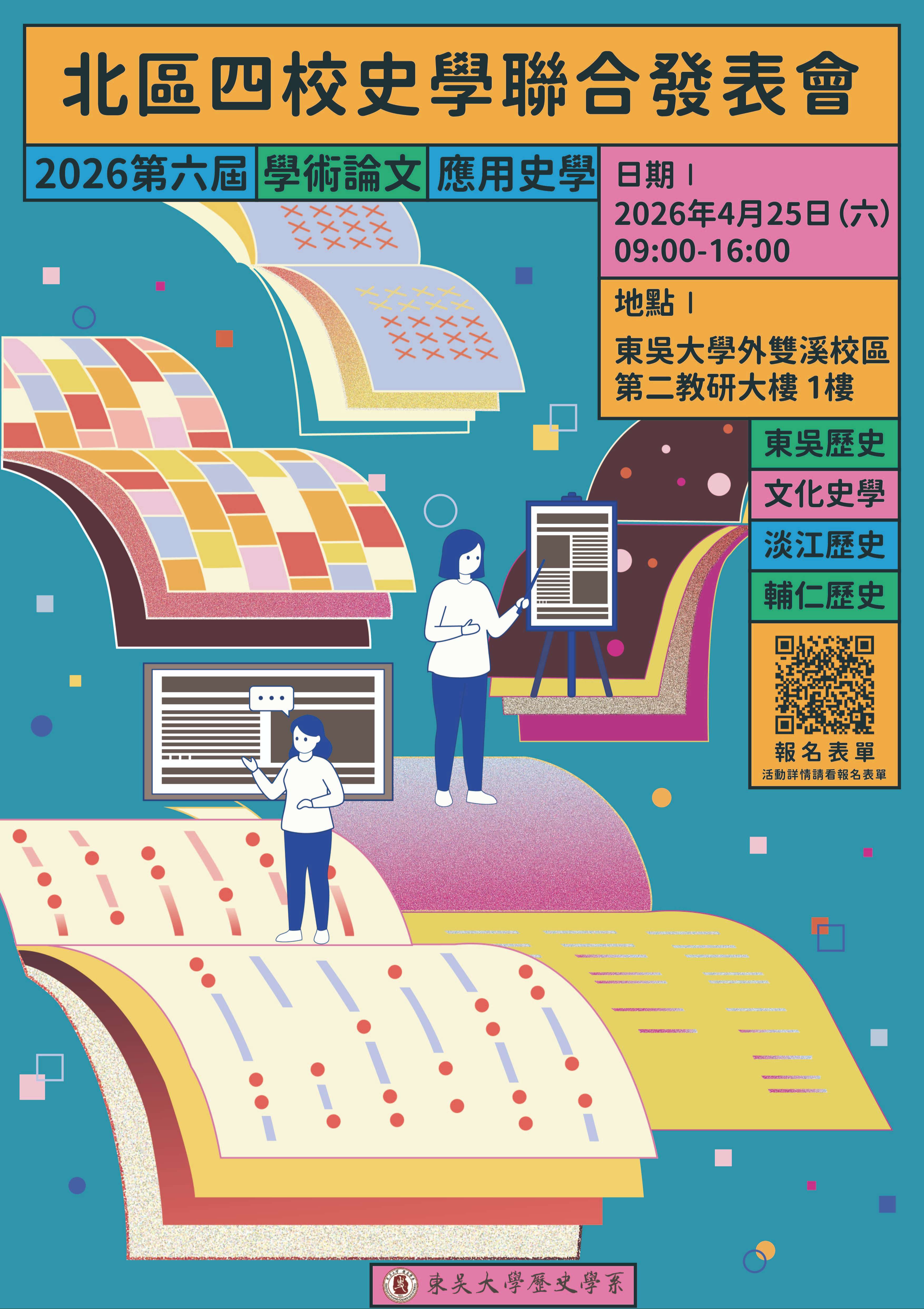 二、2026 年第六屆發表會輪由東吳大學歷史學系主辦,資訊如 下: (一)時間:2026年4月25日星期六。 (二)地點:東吳大學外雙溪校區第二教學研究大樓1樓。(臺 北市士林區臨溪路70號) (三)即日起至2026年4月17日(五)17:00止開放報名,報名連 結:https://forms.gle/66NsJSoWrdtgb1M6A。 (四)聯絡及釋疑請洽東吳大學歷史學系陳秘書,(02) 28819471分機6172、u7101119@scu.edu.tw。