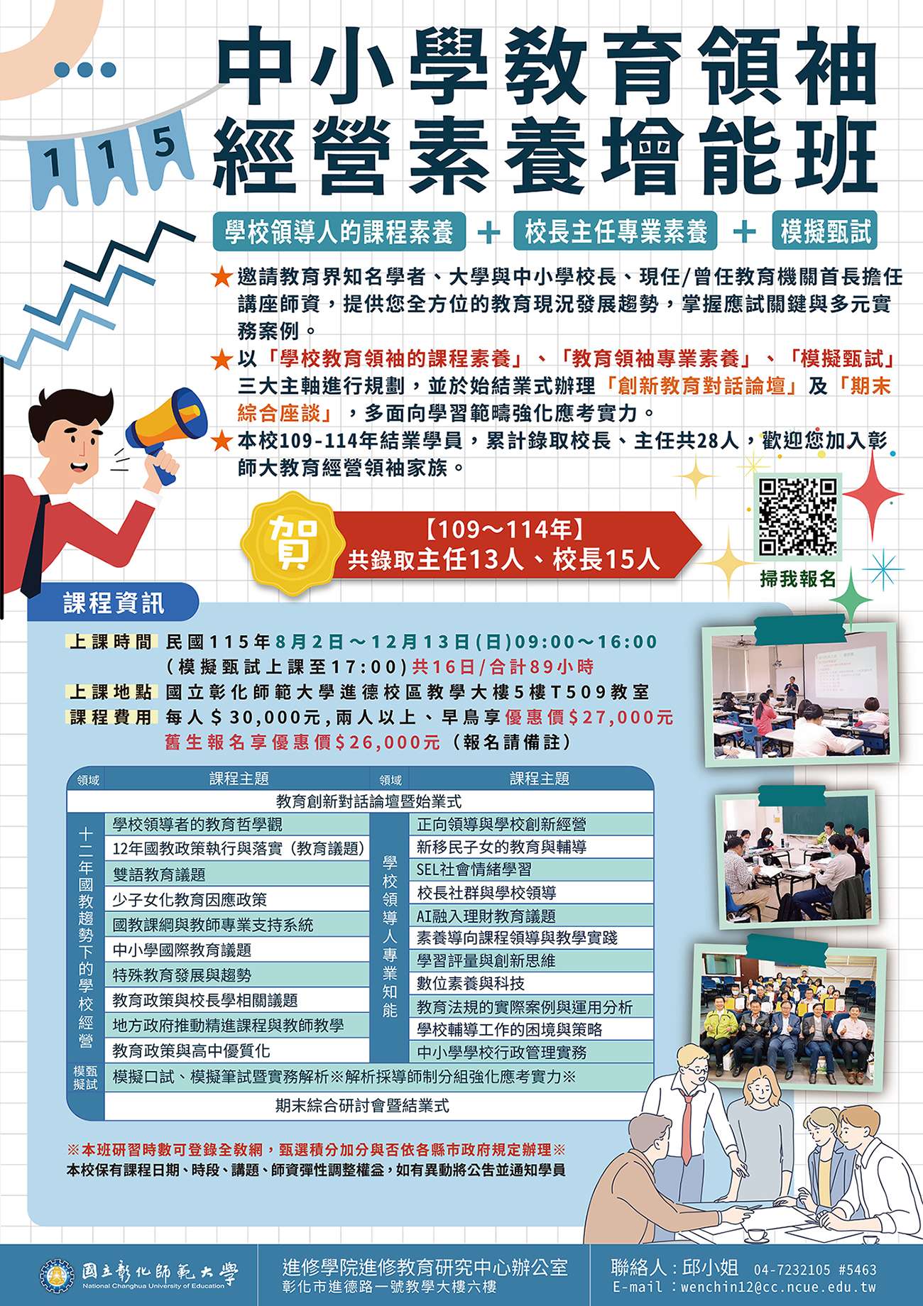 3、聘資深中小學校長組成師傅導師群,透過完整紮實的 筆試輔導練習及模擬面試實務,成為您在邁向學校教 育領袖道路上的堅強後盾。本校109-114年結業學員, 累計共錄取主任13人、校長15人,歡迎您加入彰師大 教育經營領袖家族。