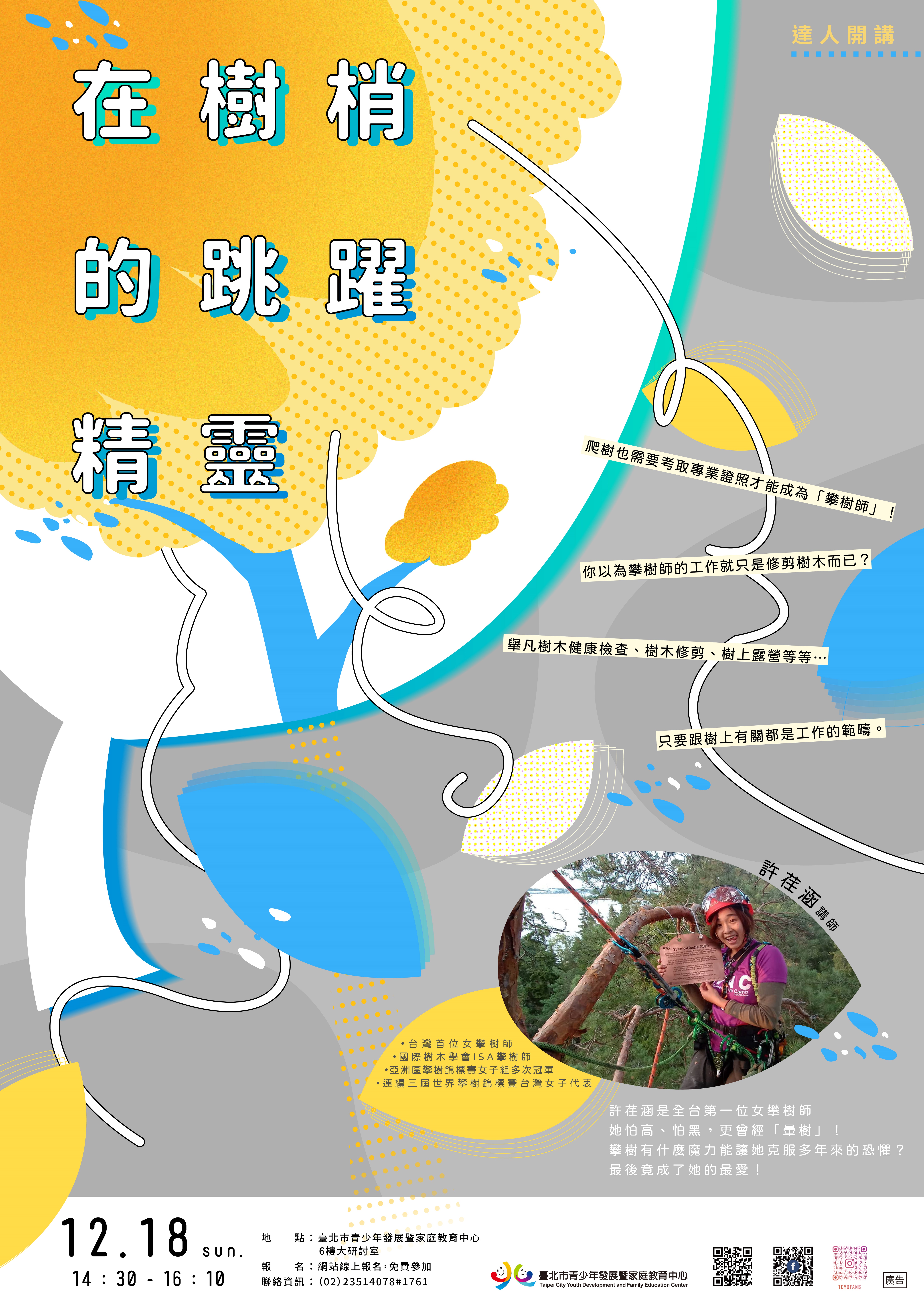 一、經由講師職涯經驗分享,讓年輕學子認識各行各業,藉以了解自身興趣及性向,進而找到未來的道路與建立自我價值;攀樹師許荏涵老師以個人經驗出發,與青年學子分享她成為攀樹師的心路歷程,以及過程中的體驗。