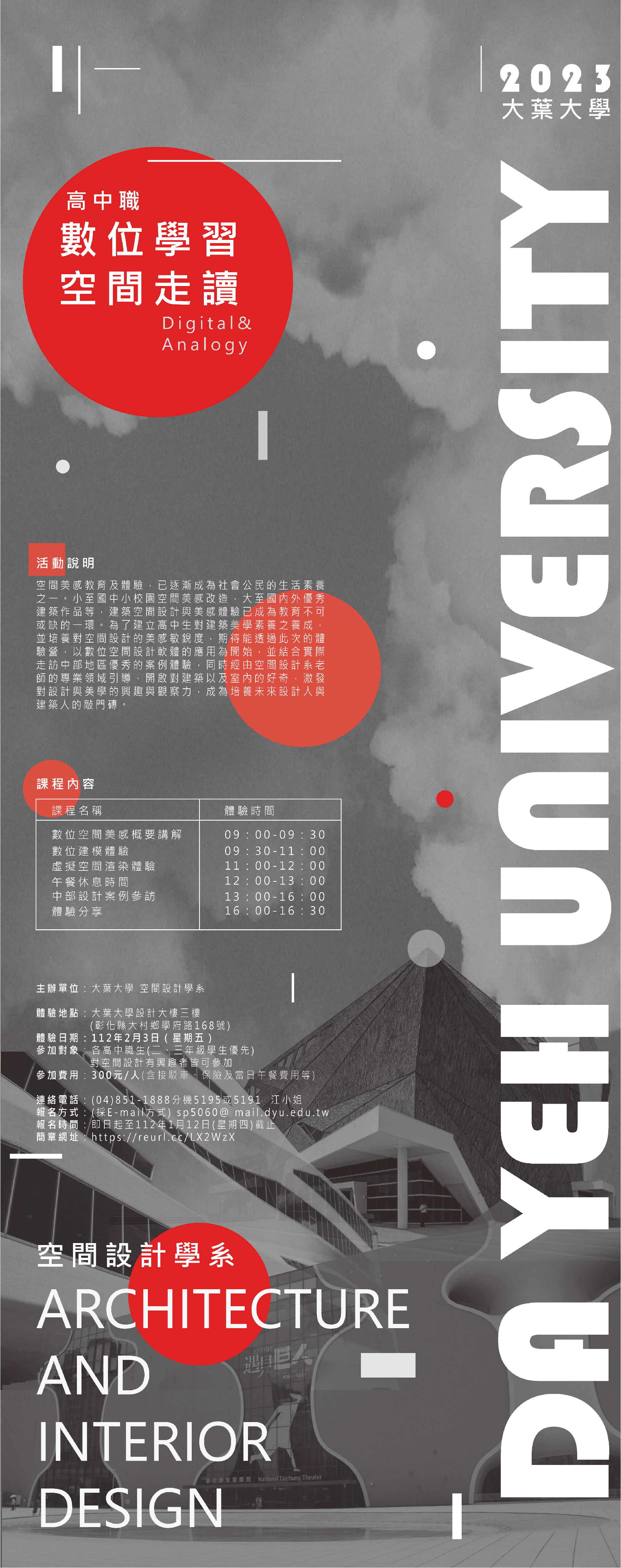 一、大葉大學空間設計學系僅訂於112年2月3日(星期五)舉辦 『2023大葉大學高中職數位學習空間走讀』,該活動旨在建立高中生對建築美學素養之養成,並培養對空間設計的美感敏銳度,期待能透過此次的體驗營,以數位空間設計軟體的應用為開始,並結合實際走訪中部地區優秀的案例體驗,同時經由空間設計系老師的專業領域引導,開啟對建築以及室內的好奇,激發對設計與美學的興趣與觀察力,成為培養未來設計人與建築人的敲門磚。