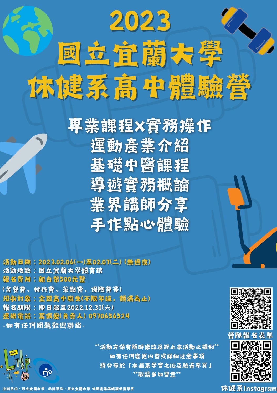 一、旨揭設計高中體驗營,期望透過專業課程搭配實務操作的角度,讓有志於從事觀光休閒與運動健康領域的高中生, 提前了解休健系所學以及未來方向。