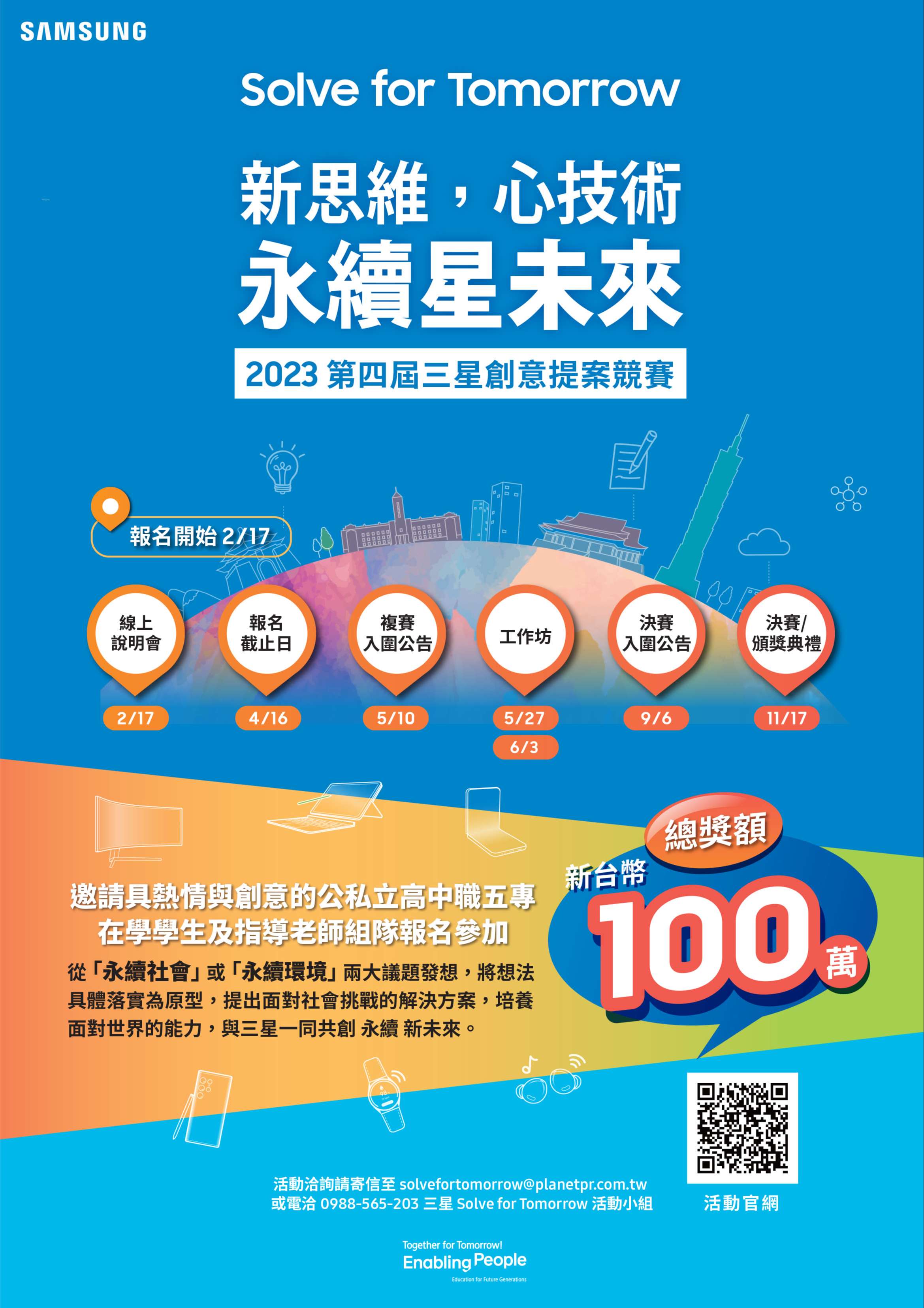 三星第四屆「Solve for Tomorrow」競賽已開跑,誠摯邀請學校鼓勵學子運用科技解決社會、環境問題,報名截止於4月16日,歡迎學生及老師組隊報名參加!