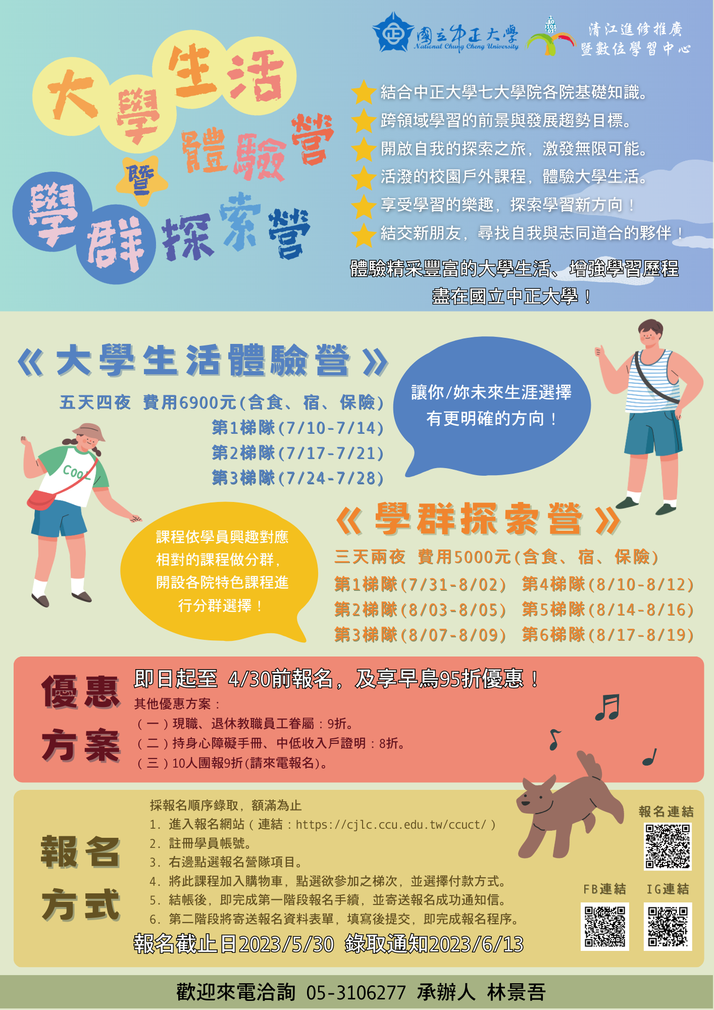 1、大學生活體驗營:112年7月10日至7月28日,5天4夜, 共3梯次。