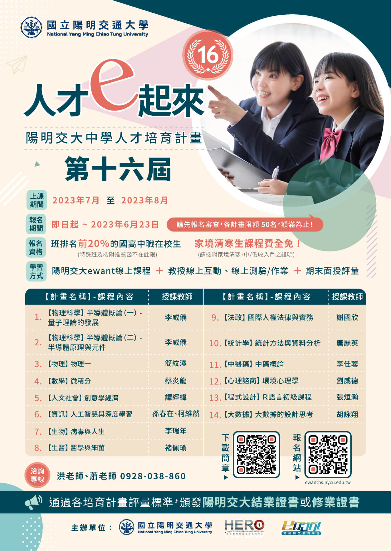 十、檢附計畫海報供參。詳細計畫內容請至本校中學人才培育計畫網站https://ewanths.nycu.edu.tw查詢、報名,或洽 計畫聯絡窗口:0928-038860,洪老師、蕭老師。