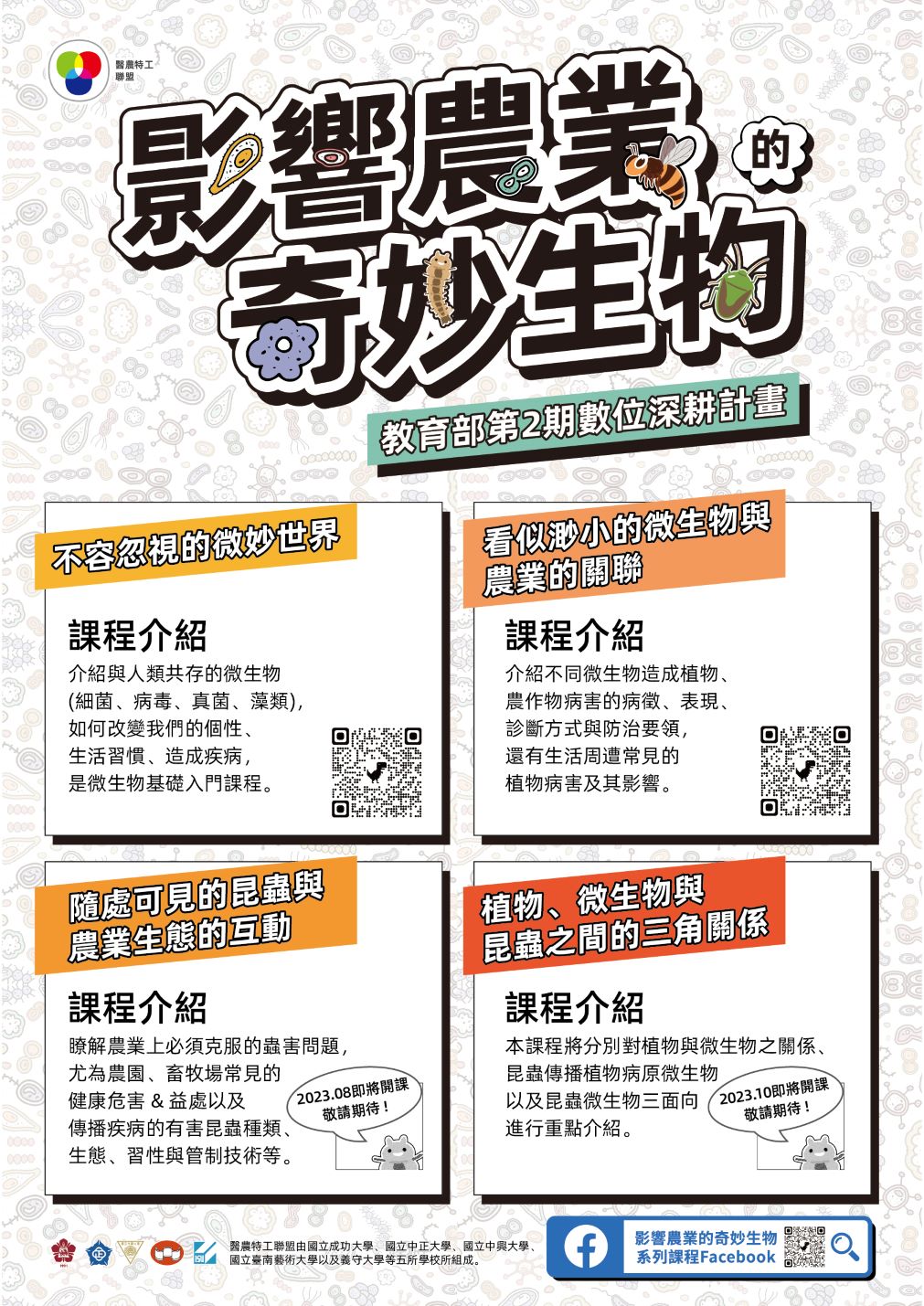 四、本課程為醫農特工聯盟「影響農業的奇妙生物」系列第2門課,為服務廣大民眾及推廣知識,精心設計教學內容由淺至深。本系列課程將帶領學員對於微生物、植物、昆蟲及農業環境全盤的認識。系列課程將接續上線開課,歡迎追蹤FB臉書粉絲專頁,可立即收到課程相關訊息及各項主題資訊分享。FB臉書粉絲專頁連結:https://www.facebook.com/profile.php?id=100090970536831&mibextid=LQQJ4d