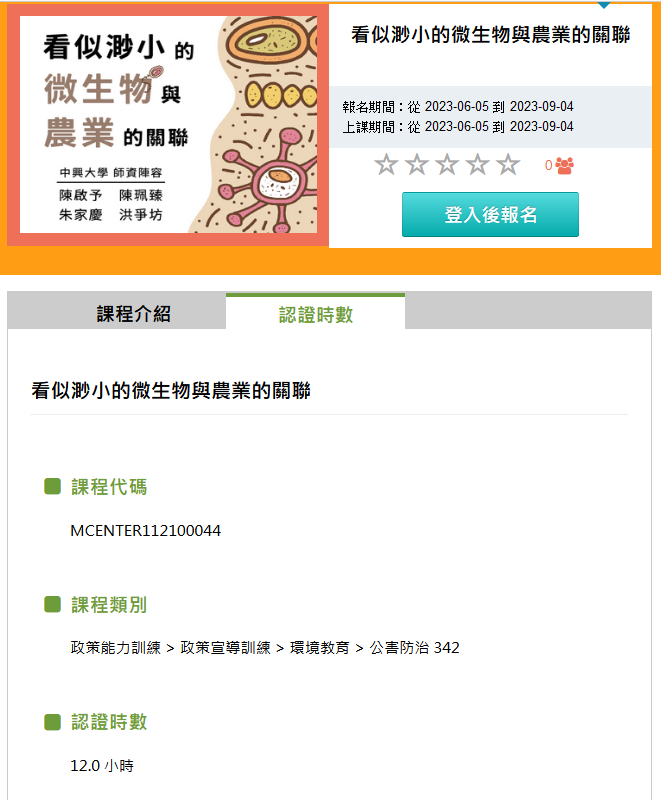 一、課程由本校植物病理學系陳啟予、陳珮臻、朱家慶、洪爭坊等4位微生物領域專長教師共同授課,內容包括介紹造成植物病原微生物之類別、特色與防治要領,介紹不同微生物造成植物病害之病徵、表現及診斷方式,介紹周遭常見之植物病害、植物病害之全球性影響。幫助學員能夠正確判斷不同類別之植物病害,並分辨和植物蟲害、或生理性障礙之不同,並建立正確防治植物病害之觀念,進而能夠體驗大自然各種微生物引起植物危害之奧妙。