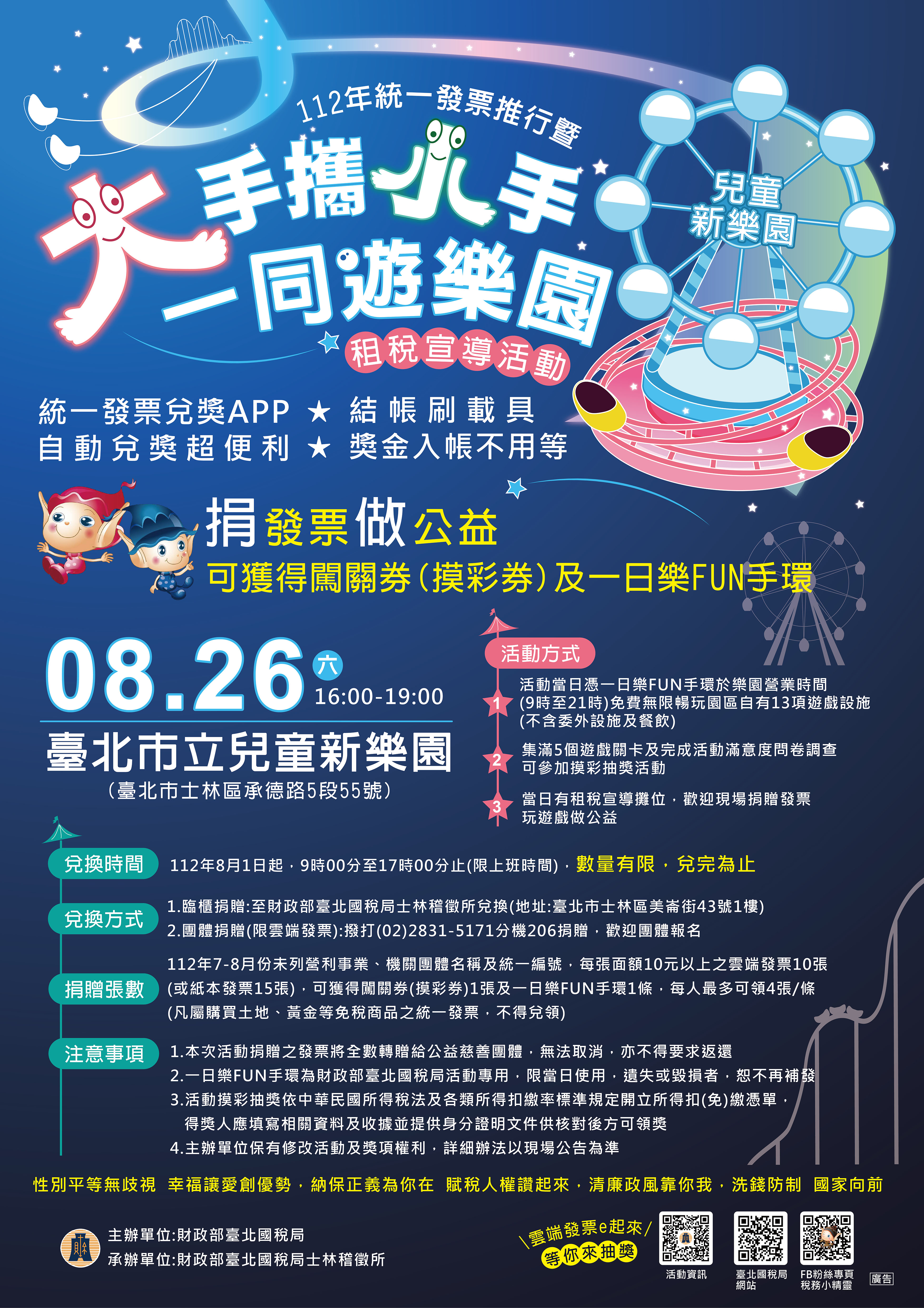 2、活動當日16時至19時在兒童新樂園樹蛙表演場安排音樂表演、各項租稅(含其他政令)宣導及有獎問答, 並設立宣導攤位,歡迎民眾現場捐贈發票、做公益 (本活動捐贈之發票將全數轉贈公益慈善團體),活動時間民眾可憑闖關券(摸彩券)前往宣導攤位闖關,集滿5個闖關遊戲章及完成活動滿意度調查問卷後,到財政部臺北國稅局服務臺確認即可參加當天摸彩抽獎活動, 獎品獎項豐富,歡迎踴躍索取參與。