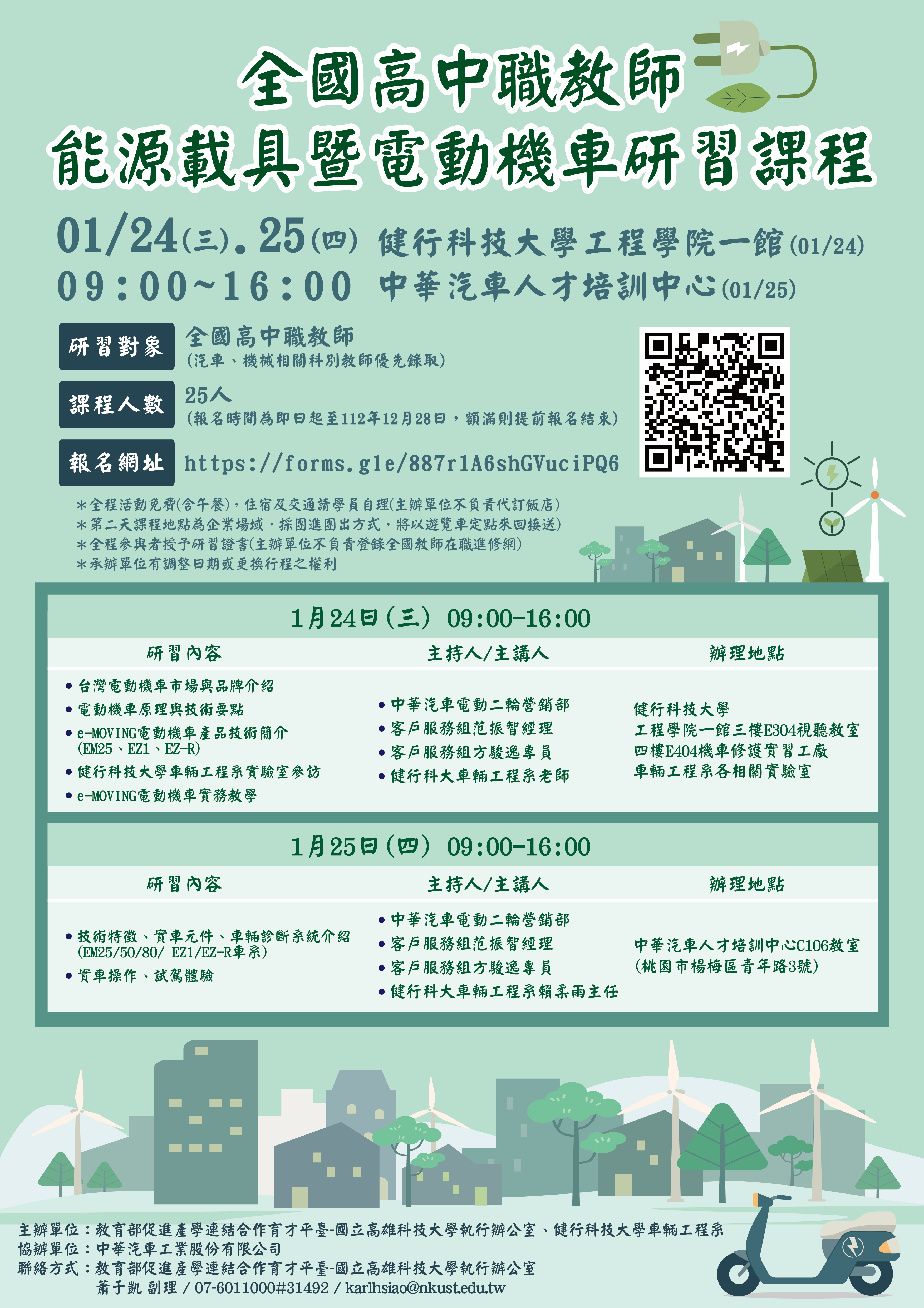 一、為強化高中職校對於再生能源及綠能載具應用了解,於應用端(電動機車)之實務技術提升,特規畫2天研習活動。