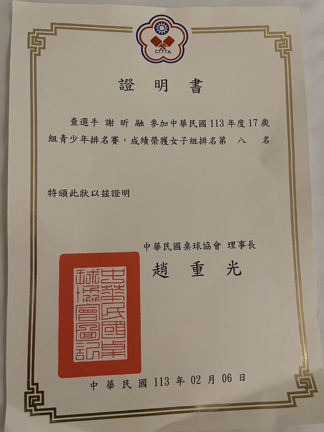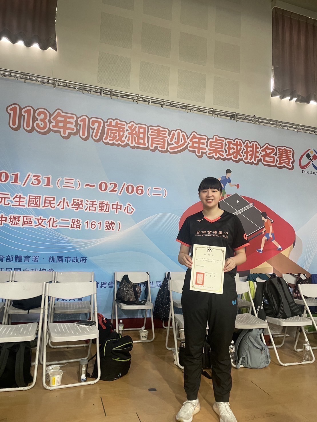 本校謝昕融同學於「113年17歲組青少年桌球排名賽」當選國手第八名,全校師生仝賀!!!