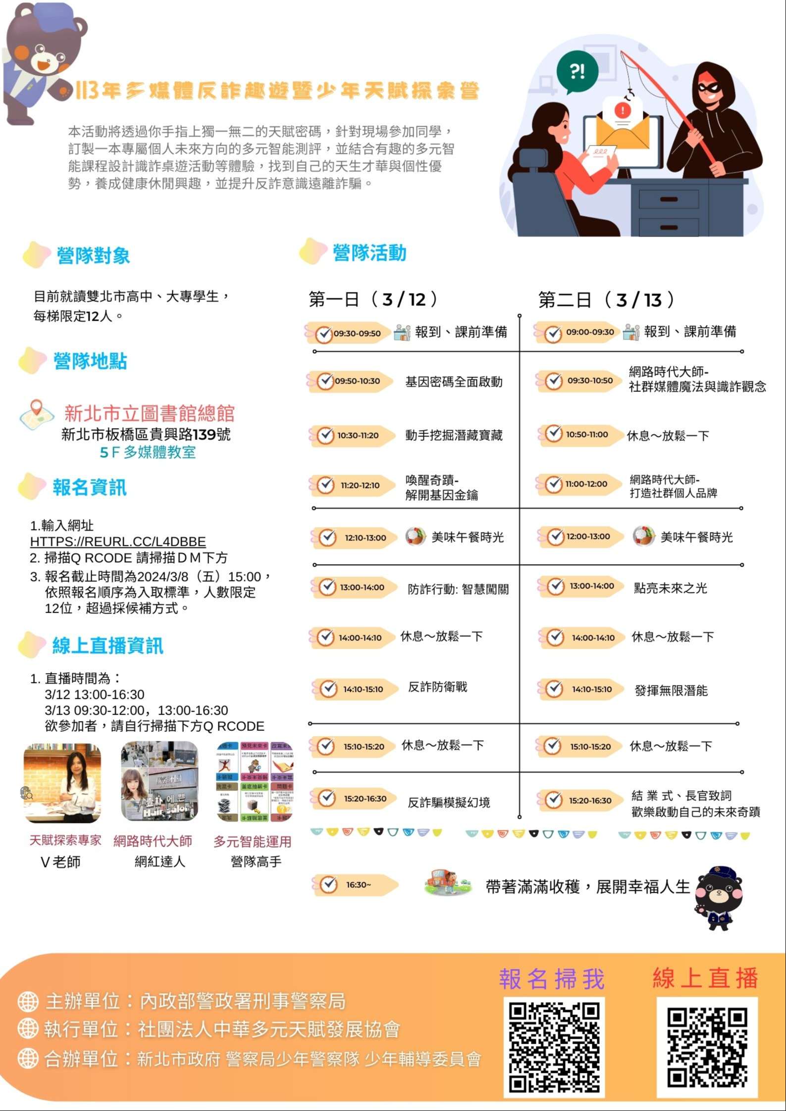 (八)報名截止:113年3月8日(星期五)15時。 三、上揭活動報名經錄取者,刑事警察局將另案函發所屬學校 請准予學生公假參與活動。