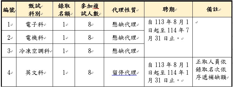 本次甄選尚餘職缺:電子科代理教師(懸缺)1人、電機科代理教師(懸缺)1人、冷凍空調科代理教師(懸缺)1人、英文科代理教師(留停)1人將進行第5次招考,報名資格、日期等請詳參本校113學年度第1次代理暨代課甄選簡章(第5階段)內容。