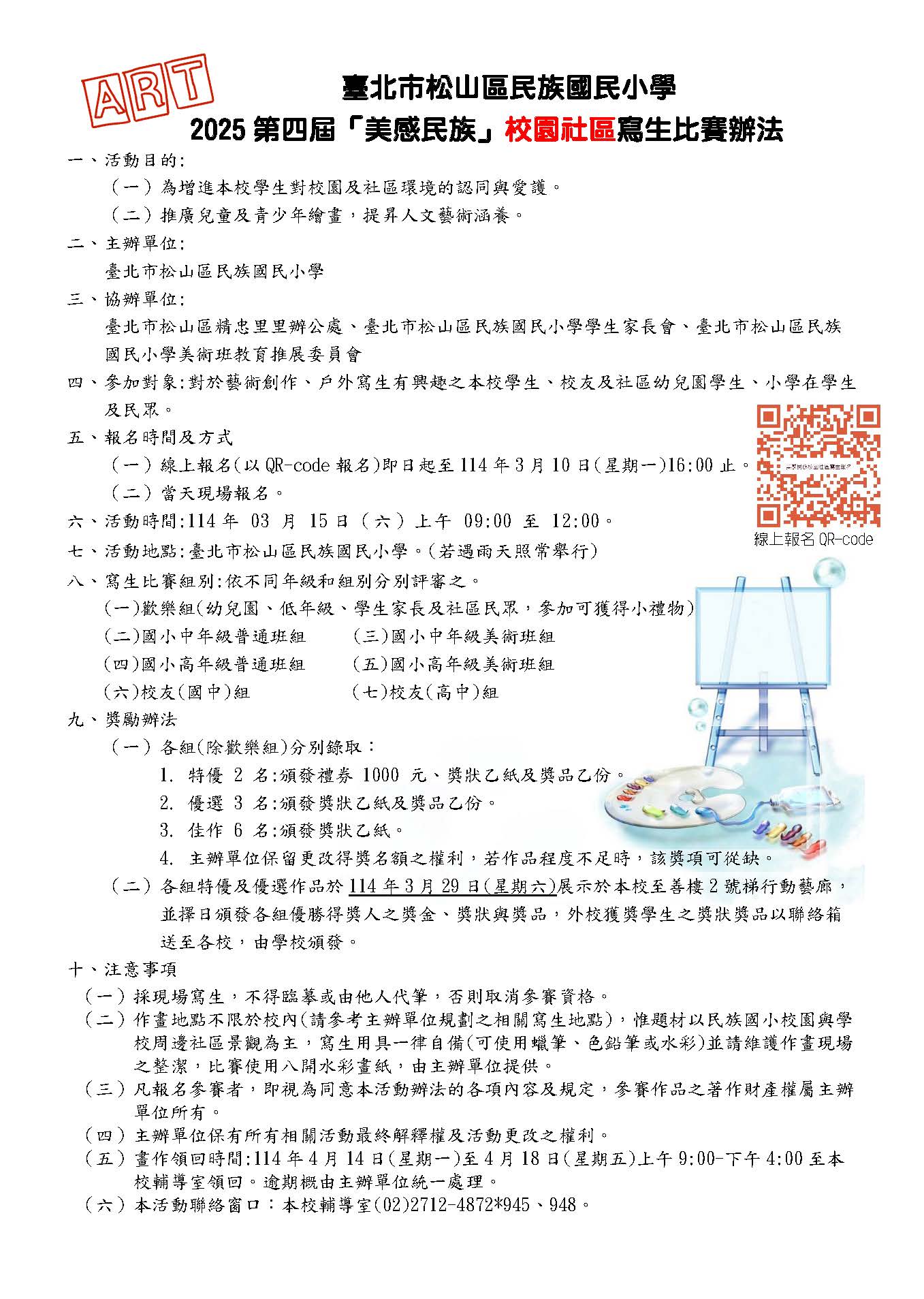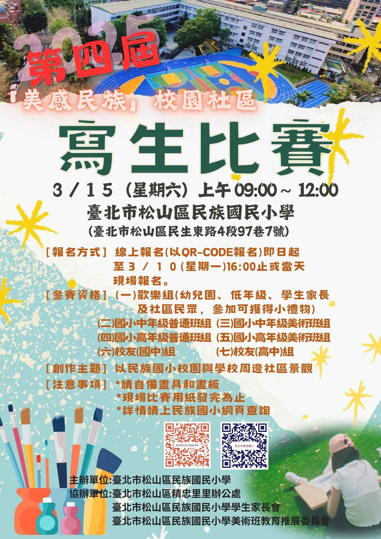 一、比賽時間:114年3月15日(星期六)早上9時至12時整。比賽地點:臺北市民族國小(臺北市松山區民生東路四段97巷7號),若遇雨天照常舉行。