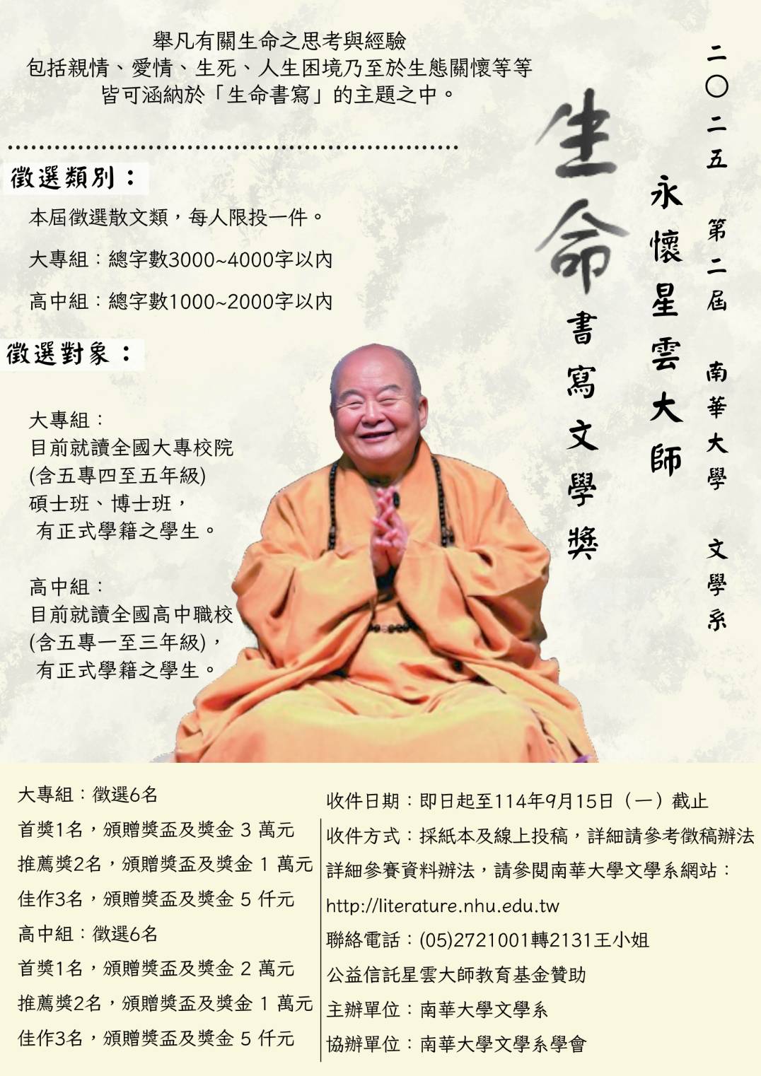 轉知南華大學辦理「2025第二屆永懷星雲大師——生命書寫文學獎」徵文活動