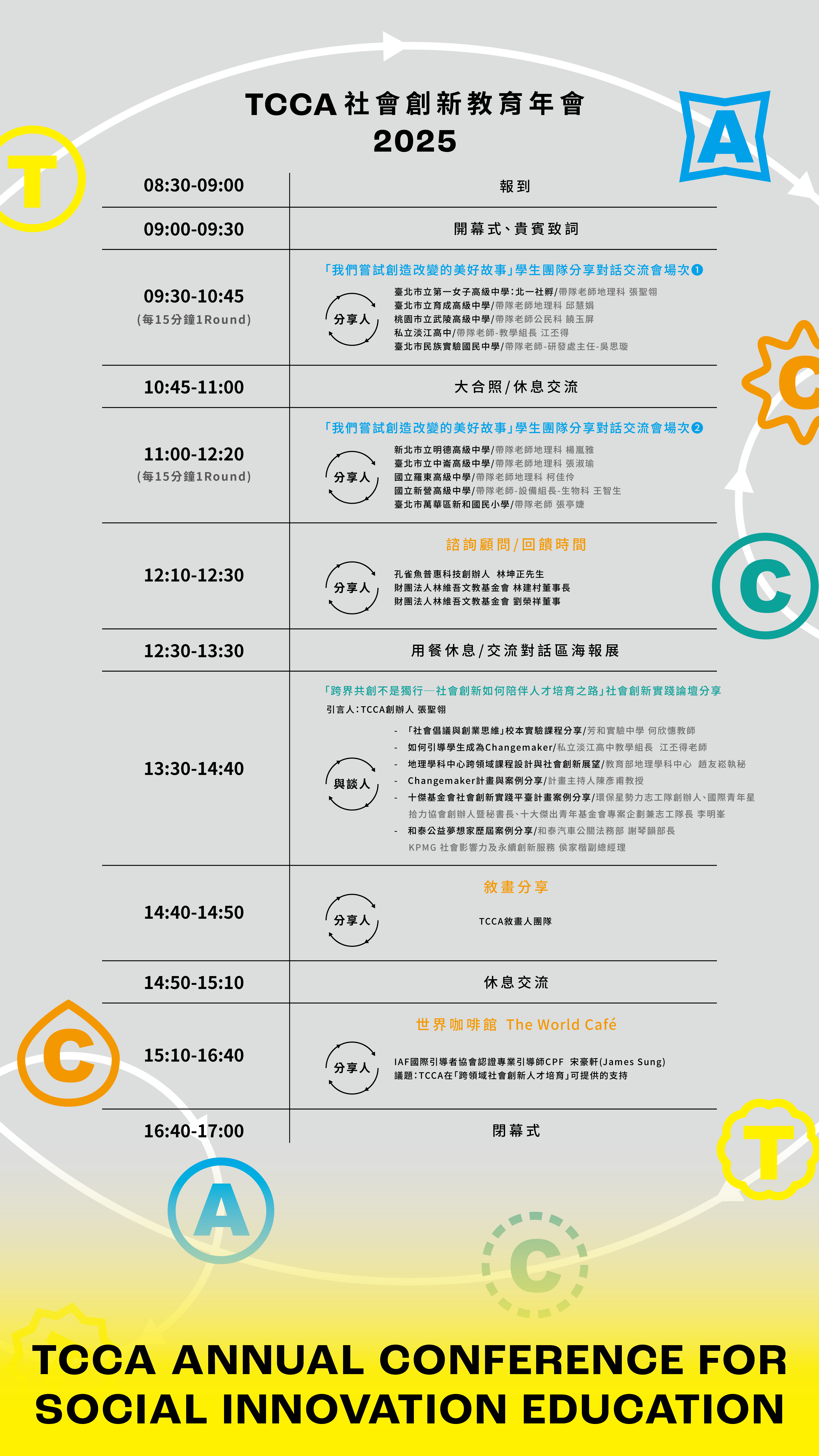 十三、活動諮詢: 活動流程與規劃歡迎來信詢問tcca0803@gmail.com,信件主旨:2025年 TCCA社會創新教育年會-來信諮詢者大名+您的需求,方便我們針對您的需求提供支持與協助。 活動公文與教師研習時數請洽臺北市立育成高中前導助理褚芝吟小姐。 電話:02-26530475#519;信箱:1028@yucsh.tp.edu.tw。