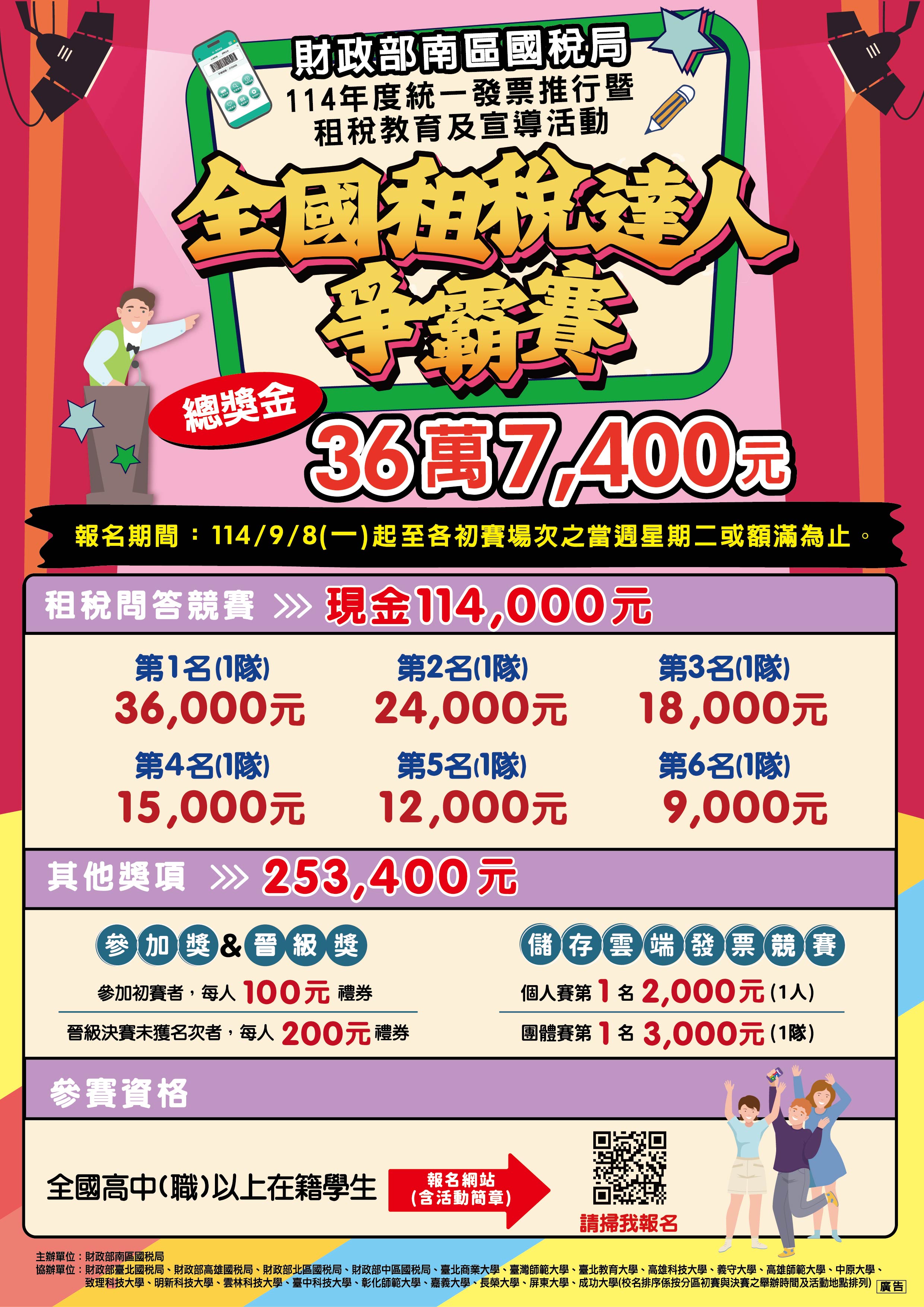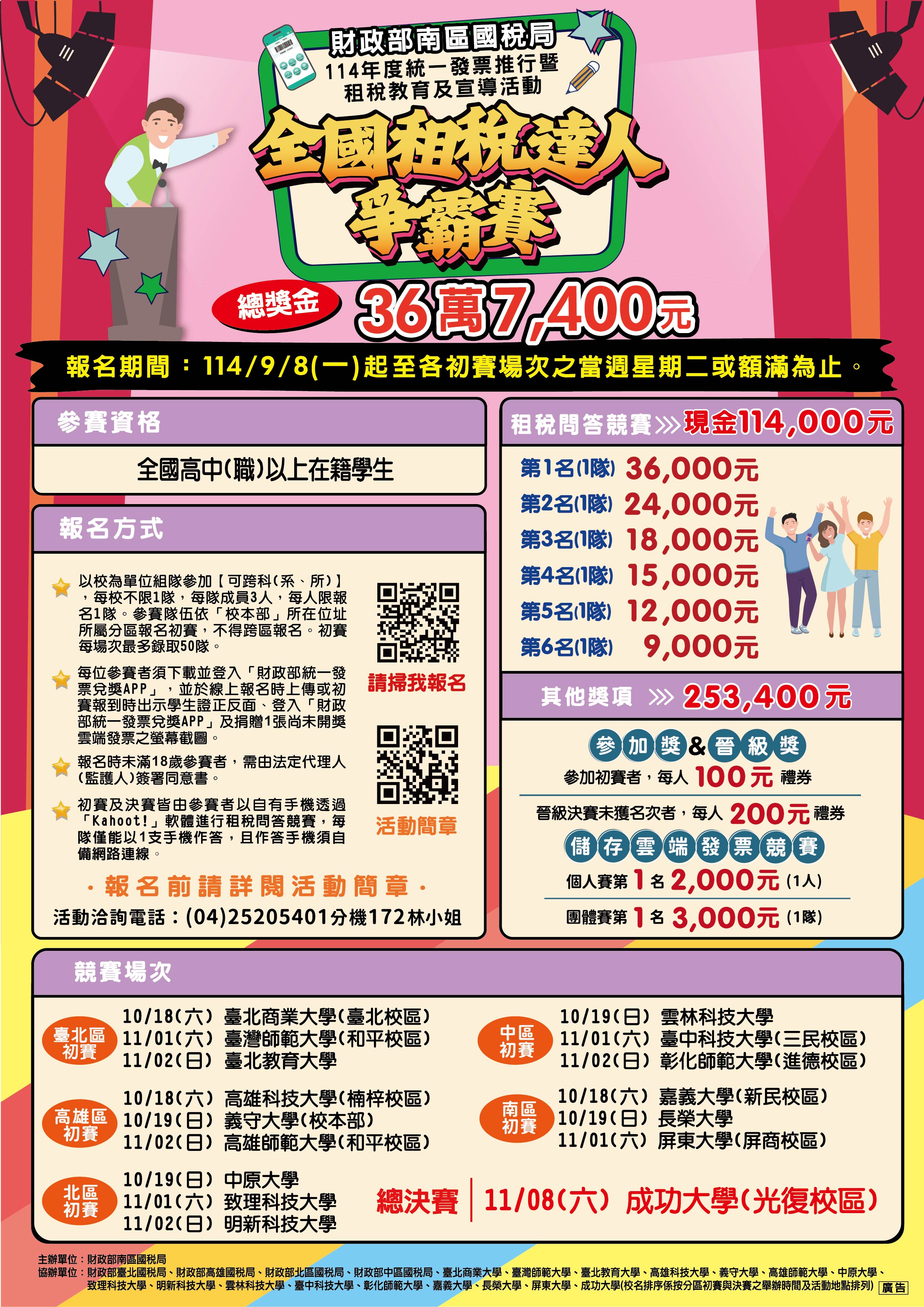 (一)活動內容:運用數位科技網路平臺軟體「Kahoot!」建立租稅短片、稅務圖卡及稅務情境案例等租稅問答題,辦理租稅問答競賽,於114年10月至11月共舉辦15場分區初賽(臺北區、高雄區、北區、中區及南區,每區各3場)及1場全國總決賽,由各地區高中(職)以上學校學生組隊報名參加競賽,鼓勵學生汲取租稅常識,活動總獎金高達36萬7,400元,人人有獎,歡迎學生組隊參加。