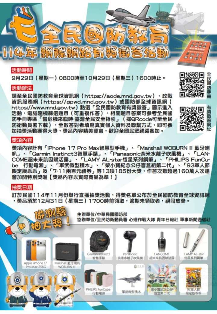 國防部辦理「全民國防教育網際網路有獎徵答活 動」,活動自9月29日8時至10月29日16時止,答對者可 抽智慧型手機、藍芽喇叭、智慧手錶,歡迎民眾踴躍參 加,詳見全民國防教育全球資訊網(https://aode. mnd.gov.tw)