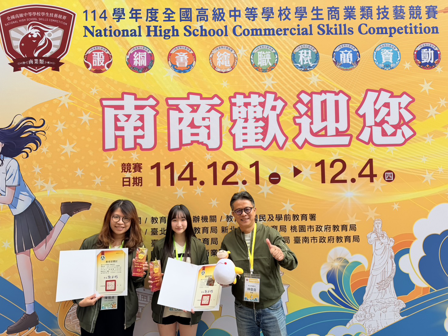 恭喜應英三忠 吳晨寧 同學,於 114 學年度全國商業類技藝競賽—職場英文職種 中表現優異,榮獲 金手獎第 5 名 的佳績,為校爭光!